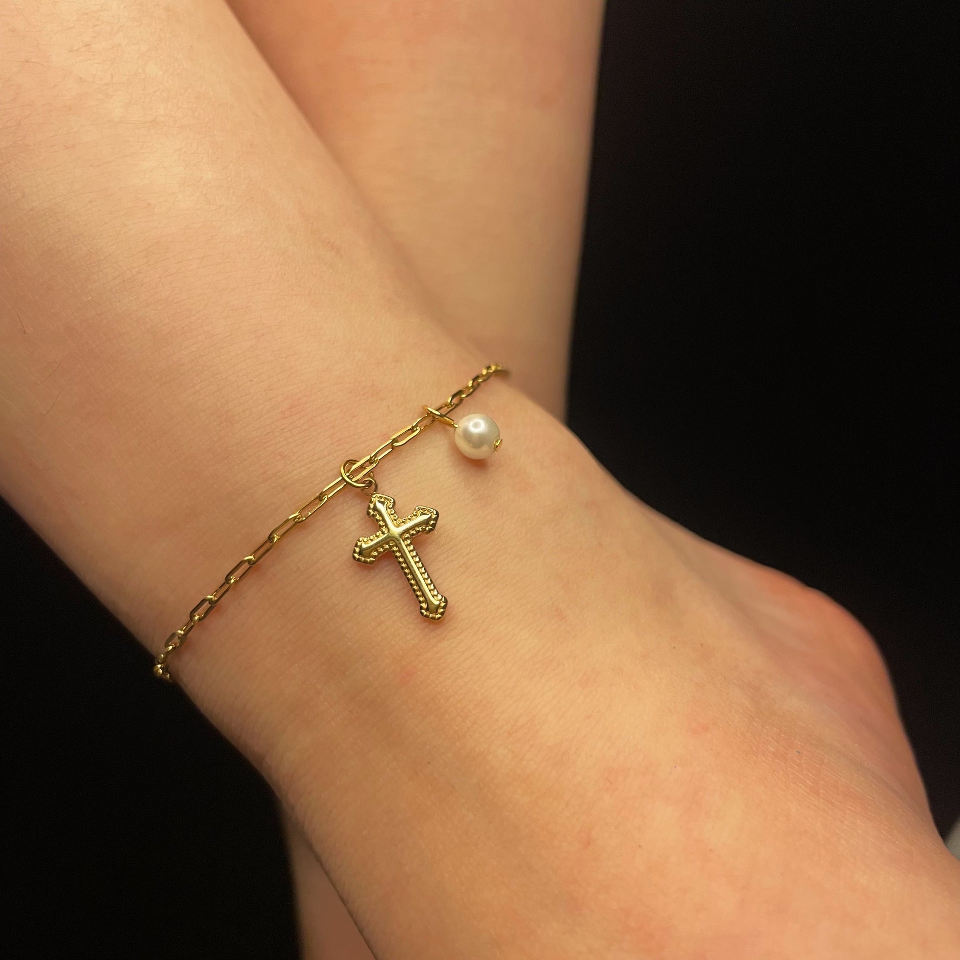A delicate gold chain with a cross charm and a tiny pearl. It brings a gentle, meaningful vibe to your ankle, perfect for daily wear or special moments.